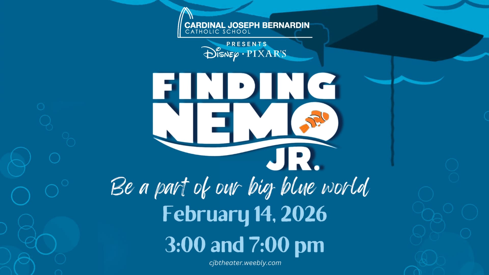 Dive into an ocean of fun as Cardinal Joseph Bernardin Catholic School students bring Pixar's "Finding Nemo" to life. It is going to be a totally fin-tastic and a shore thing you will not want to miss. Grab your fins and be a part of our big blue world! To Purchase Tickets, visit: https://cur8.com/15969/project/136489