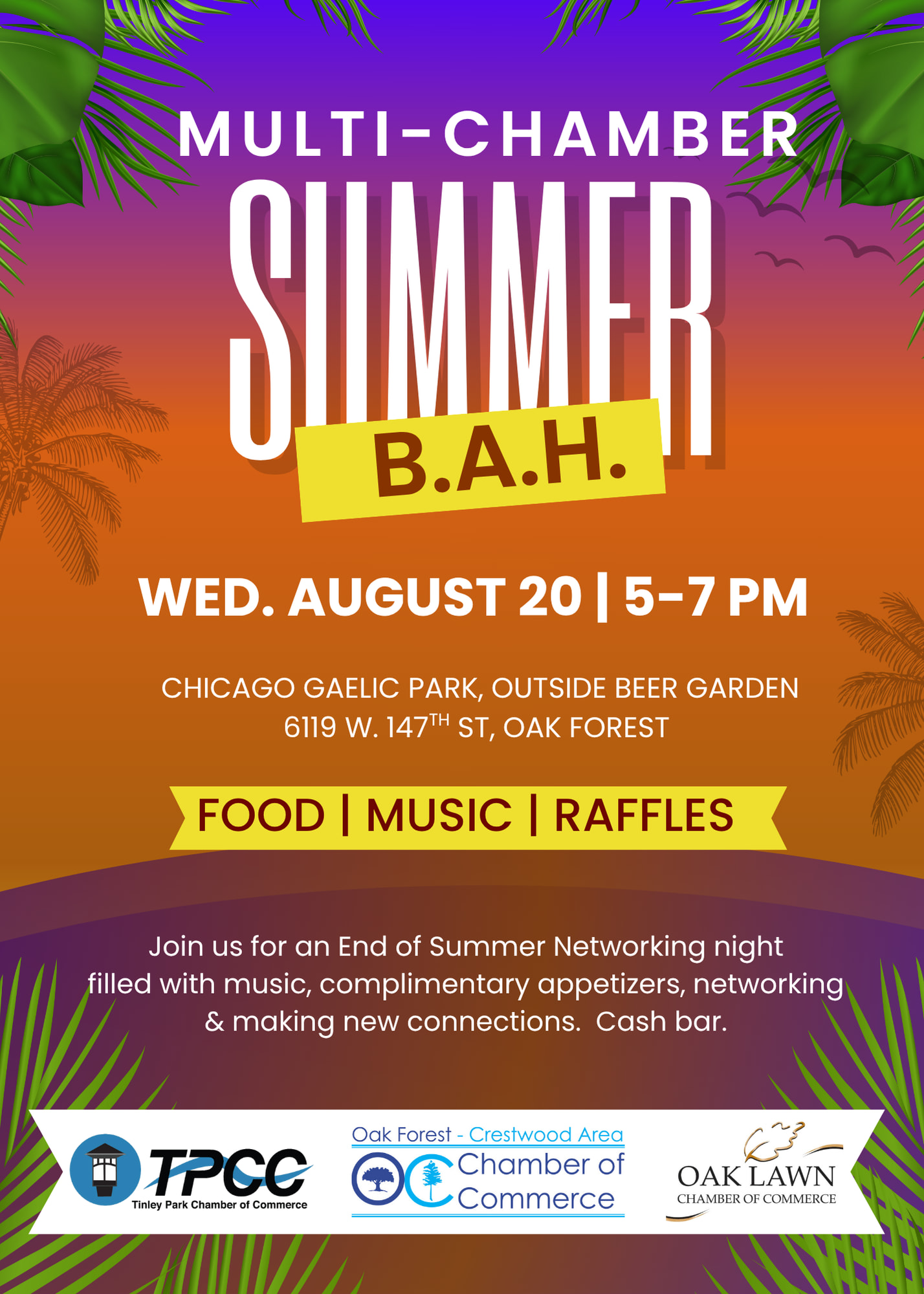 Join the Tinley Park Chamber of Commerce along with Oak Forest, Oak Lawn, and Evergreen Park Chambers for an "End of Summer" networking event filled with music, complimentary appetizers, raffle prizes and making new connections. Event will be held at Gaelic Park located at 6119 W. 147th St. in Oak Forest from 5pm-7pm on Wednesday, August 20th, 2025.