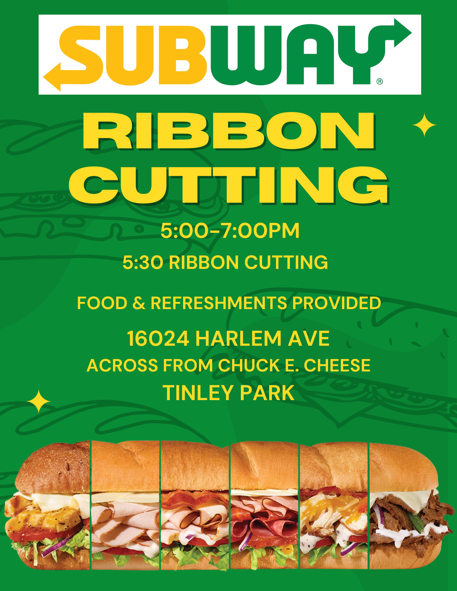 Come join us for a Subway Ribbon Cutting! Their brand new location at 16024 Harlem Ave in Tinley Park (across from Chuck E. Cheese). Come see their new location on Wednesday, August 27th at 5:00pm. They will have snacks, drinks and of course, Subway sandwiches! Ribbon Cutting will take place at 5:30pm.